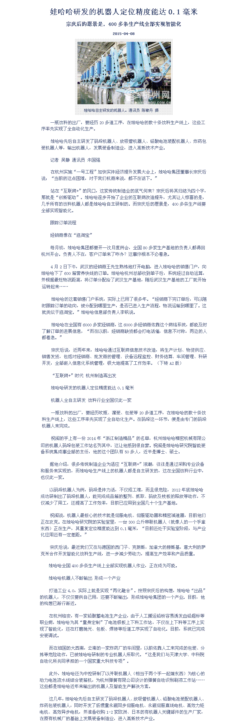 娃哈哈研发的机器人定位精度能达0.1毫米
