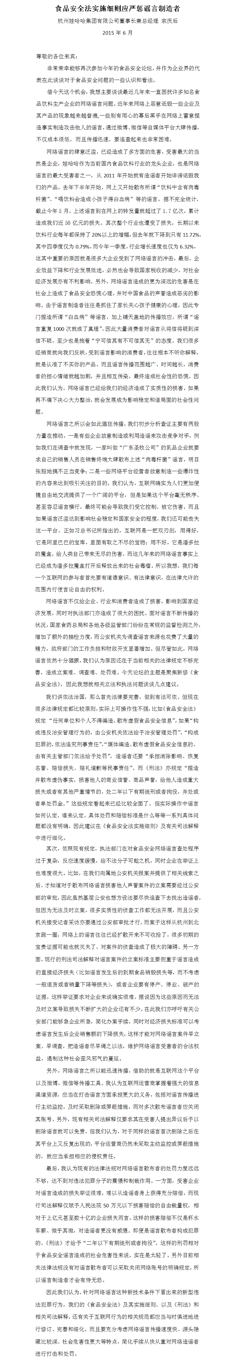 宗庆后:食品安全谣言导致娃哈哈损失50亿