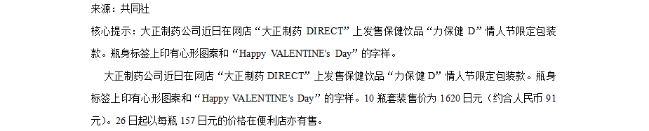 日本大正制药发售保健饮品“力保健D”情人节限定款