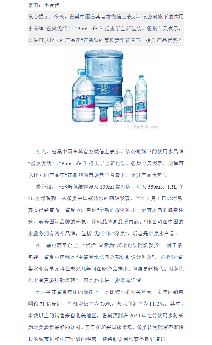 雀巢饮用水品牌“雀巢优活”推出全新包装