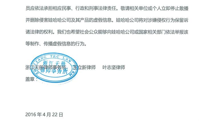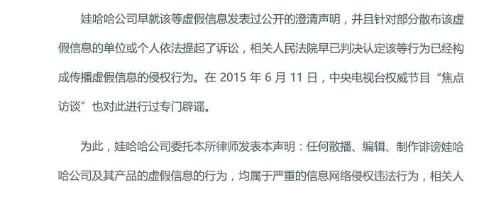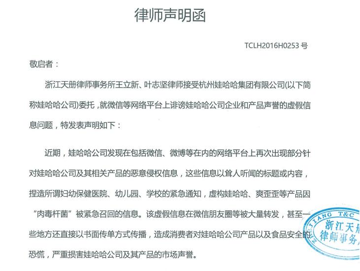 来源: 新华网 近期微信、微博等在内的网络平台上再次出现部分针对娃哈哈公司及其相关产品的恶意侵权信息,这些信息以耸人听闻的标题或内容,捏造所谓妇幼保健医院、幼儿园、学校的紧急通知,虚构娃哈哈、爽歪歪等产品因“肉毒杆菌”被紧急召回的信息。 为此,浙江天册律师事务所王立新、叶志坚律师接受杭州娃哈哈集团有限公司委托,就微信等网络平台上诽谤娃哈哈公司企业和产品声誉的虚假信息问题,特发表声明如下: