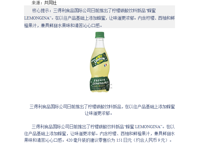 三得利推出添加蜂蜜的柠檬碳酸饮料