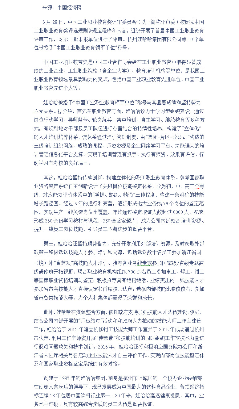 娃哈哈荣获“中国工业职业教育领军”单位称号