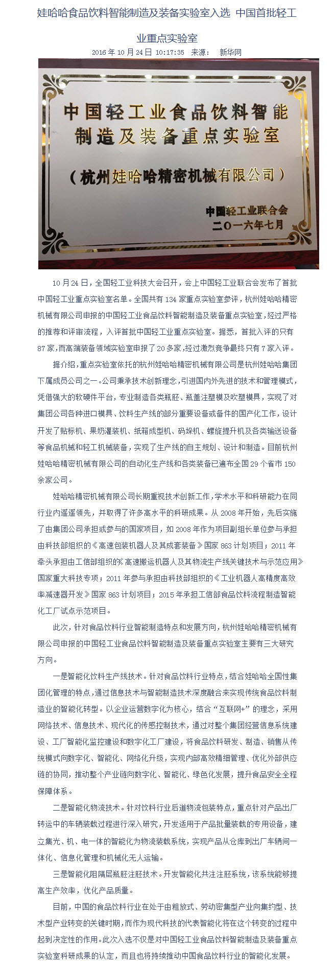 娃哈哈食品饮料智能制造及装备实验室入选 中国首批轻工业重点实验室