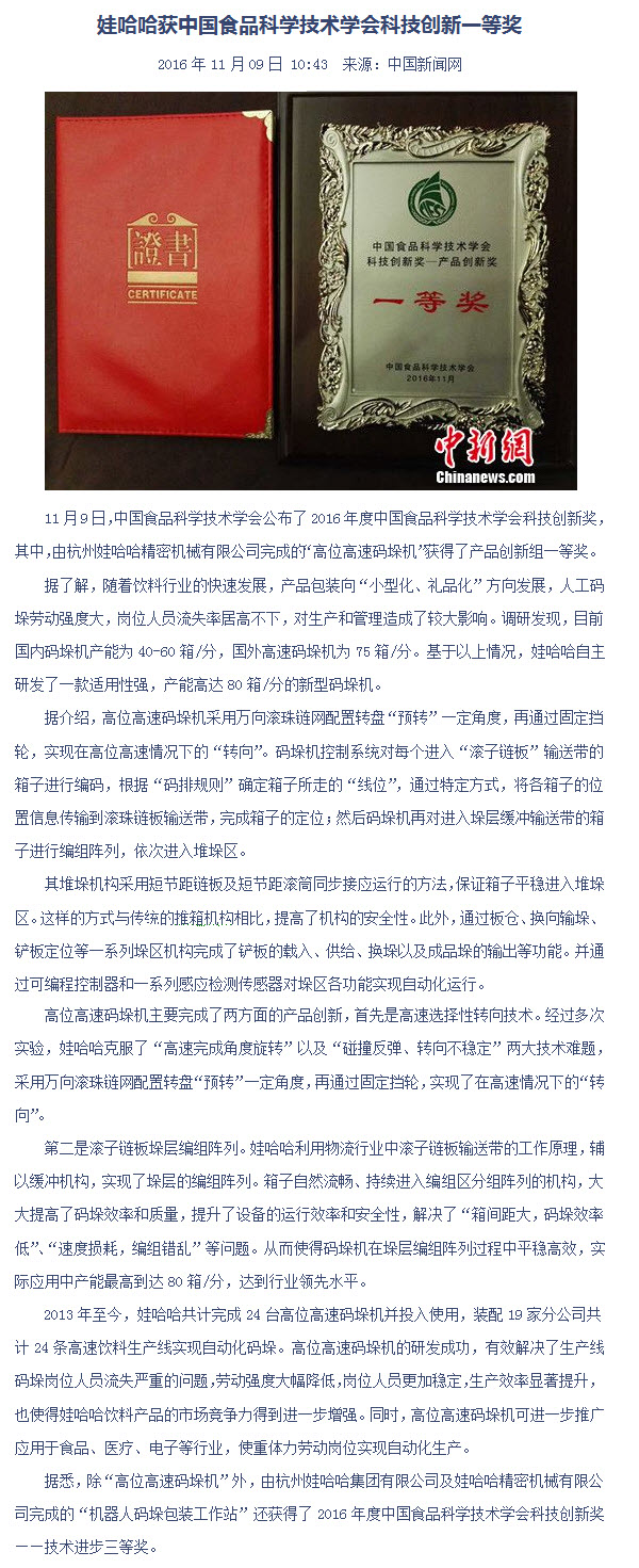 娃哈哈获中国食品科学技术学会科技创新一等奖