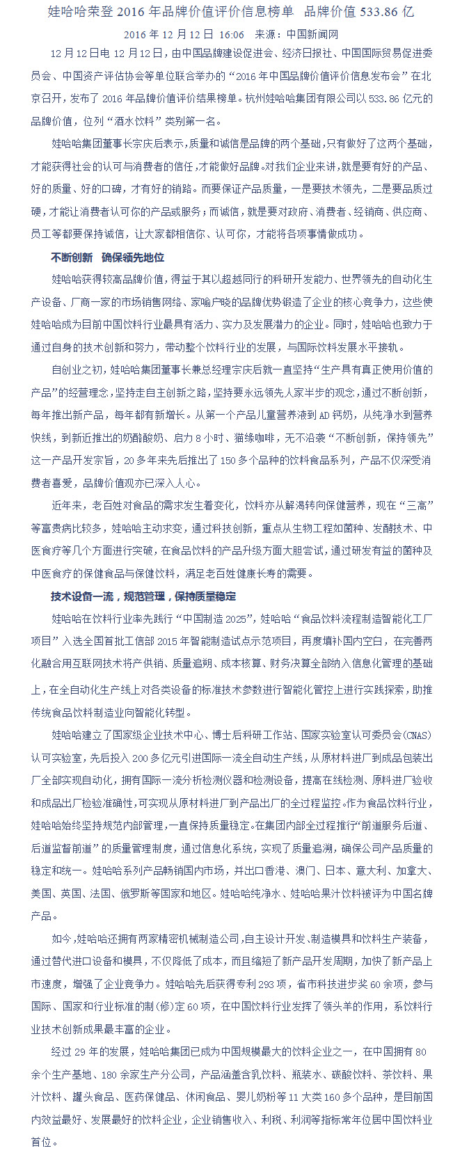 娃哈哈荣登2016年品牌价值评价信息榜单 品牌价值533.86亿