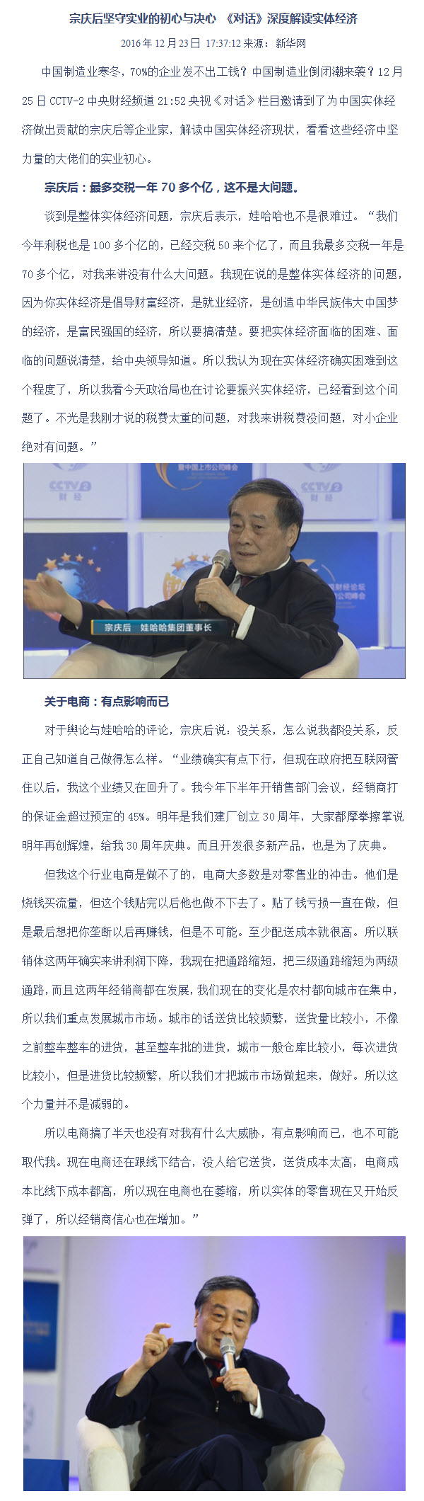 宗庆后坚守实业的初心与决心 《对话》深度解读实体经济