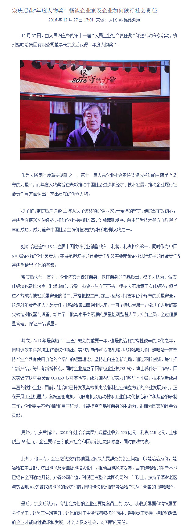 宗庆后获“年度人物奖”畅谈企业家及企业如何践行社会责任