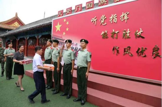 正值三伏天的北京,骄阳似火,酷热难耐。7月29日上午十一时许,西安冰峰饮料有限公司总经理陈卫平、副总经理段莉娜及经销商代表一行,带着冰峰汽水、冰峰酸梅汤,走进天安门国旗护卫队,为在酷暑中坚持训练、执勤的官兵们送来一缕清凉,以及冰峰人诚挚的敬意。
