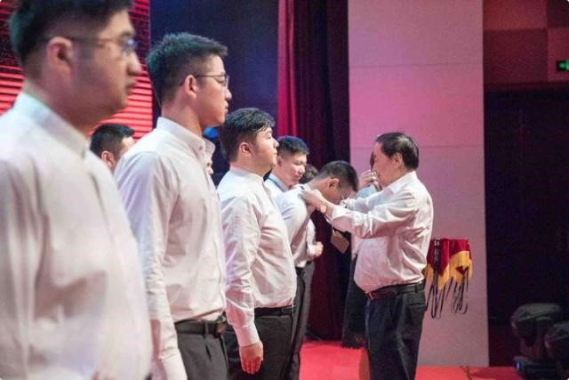 娃哈哈集团公司董事长宗庆后为18位新党员代表一一佩戴带有党徽、象征党员身份的上岗证。“我志愿加入中国共产党……”在宗庆后的带领下,新党员们面向党旗庄重对组织立下誓言。