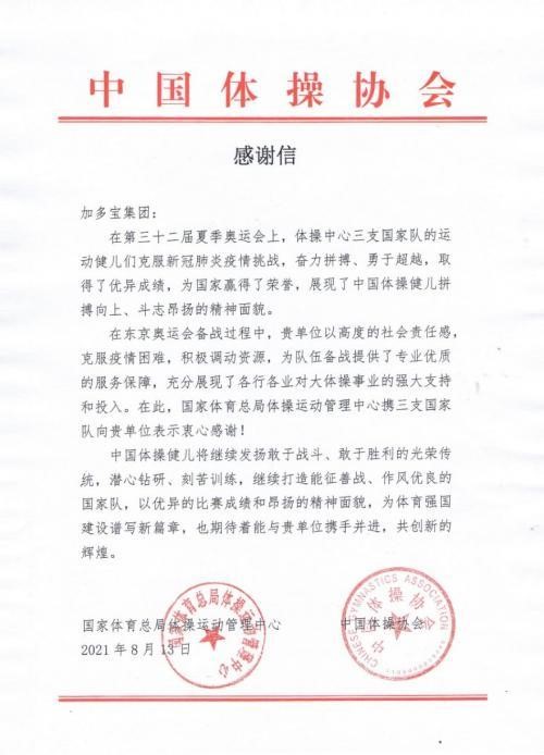 3金、3银、2铜,五年卧薪尝胆,中国国家体操队得胜凯旋!2021年8月13日,中国体操协会向加多宝集团发来感谢信,感谢加多宝为体操队提供了专业优质的服务保障,并期待能与加多宝集团携手并进,共创新的辉煌。