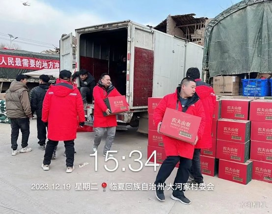 12月18日23时59分,甘肃临夏州积石山县发生6.2级地震。面对突如其来的灾情,农夫山泉的一线员工紧急展开行动,迅速调拨饮用水驰援灾区,震后凌晨即将第一批瓶装水送达现场临时安置点。在余震不断的情况下,农夫山泉员工赶赴一线,继续为灾区人民支援物资。 地震发生后,农夫山泉迅速响应,农夫山泉甘青宁分公司迅速成立救灾物资小组,组织调拨饮用水物资。凌晨2点半,第一批9600瓶饮用水抵达现场临时安置点。清晨6点,24000瓶饮用水抵达地震严重地区临夏积石山县大河家镇的灾民安置点。之后农夫山泉又向应急救灾中心送去9600瓶饮用水和4L装3600桶予以支援。