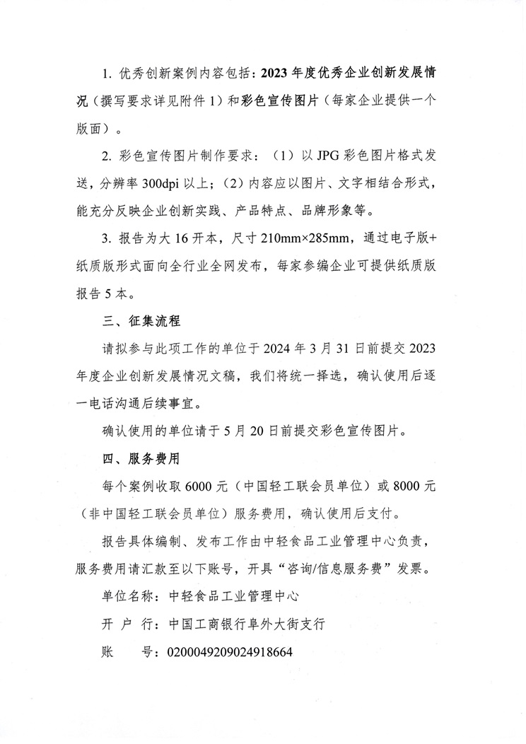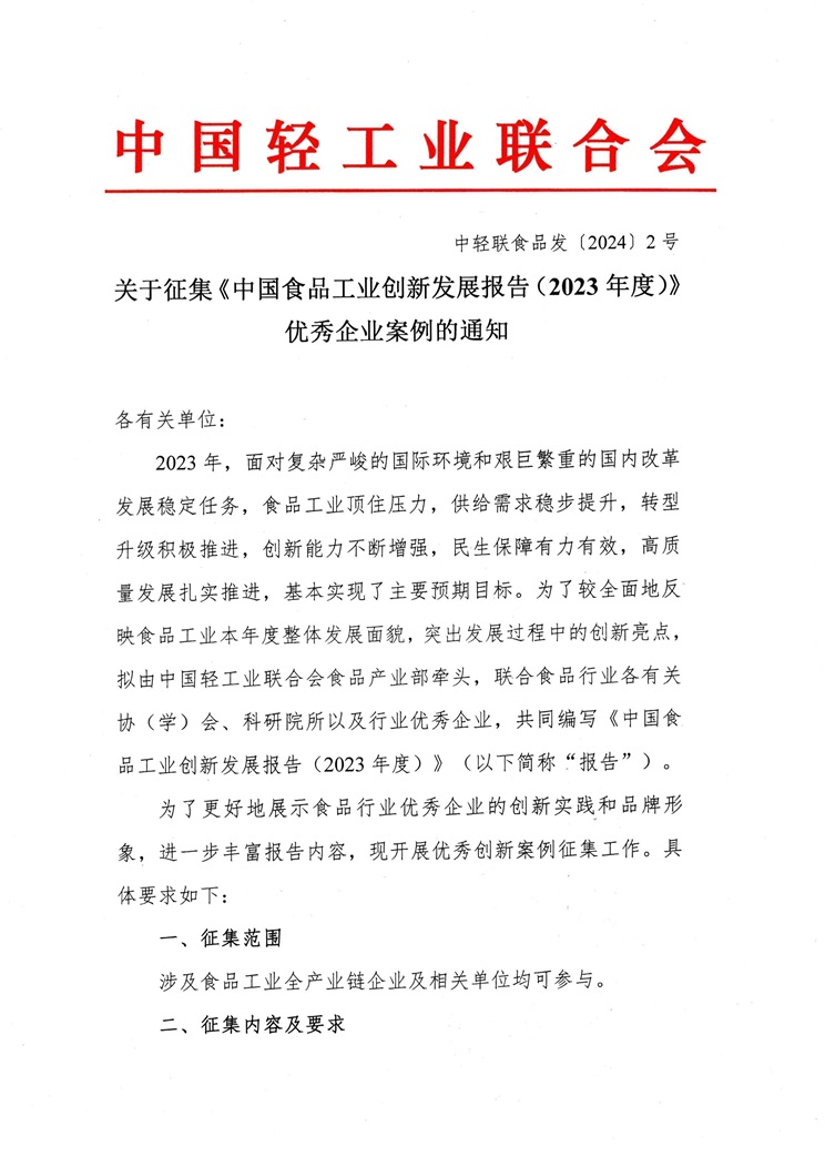 关于征集《中国食品工业创新发展报告(2023年度)》优秀企业案例的通知