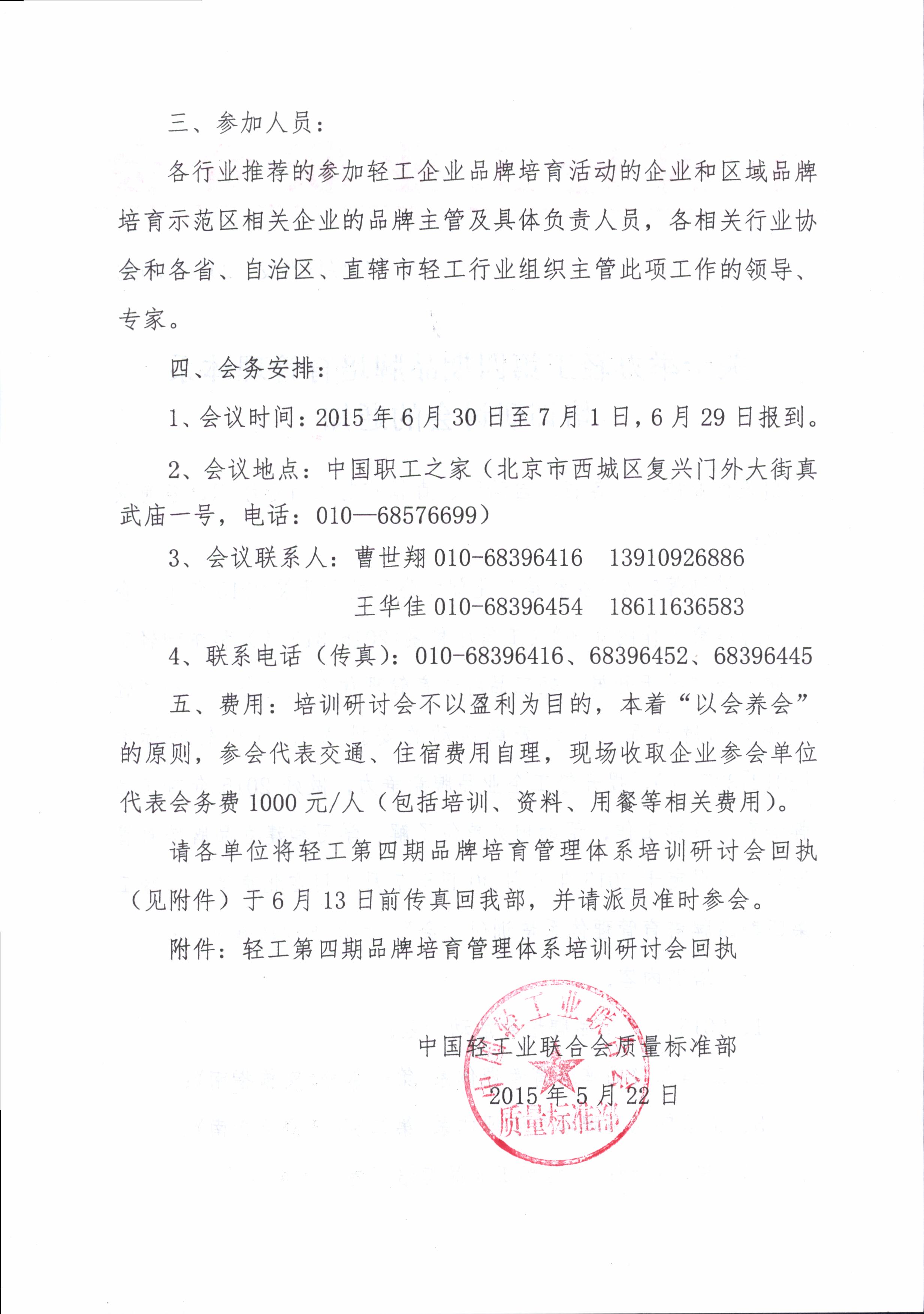 中国轻工业联合会于2015年6月30日-7月1日举办轻工第四期品牌培育管理体系培训研讨会,通知如下: