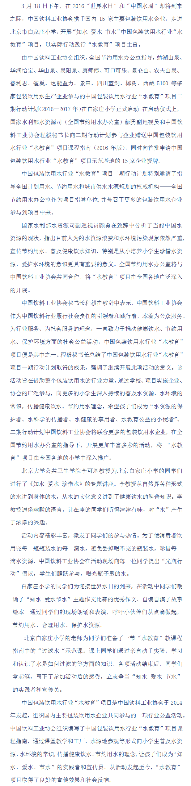 世界水日 中国包装饮用水行业“水教育”项目走进校园/“水教育”二期行动计划正式启动
