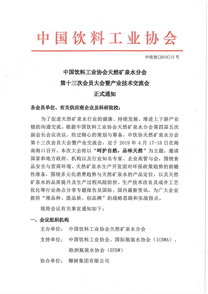 中国饮料工业协会天然矿泉水分会第十三次会员大会暨产业技术交流会正式通知