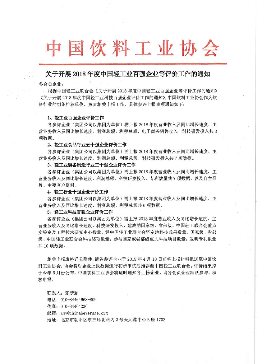 关于开展2018年度中国轻工业百强企业等评价工作的通知