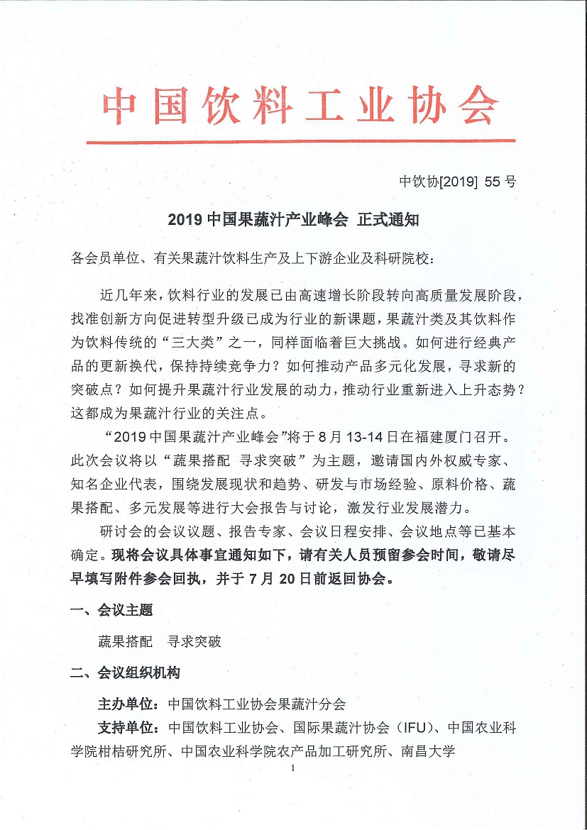 2019中国果蔬汁产业峰会 正式通知