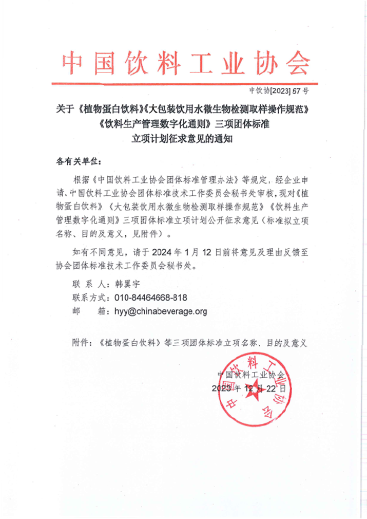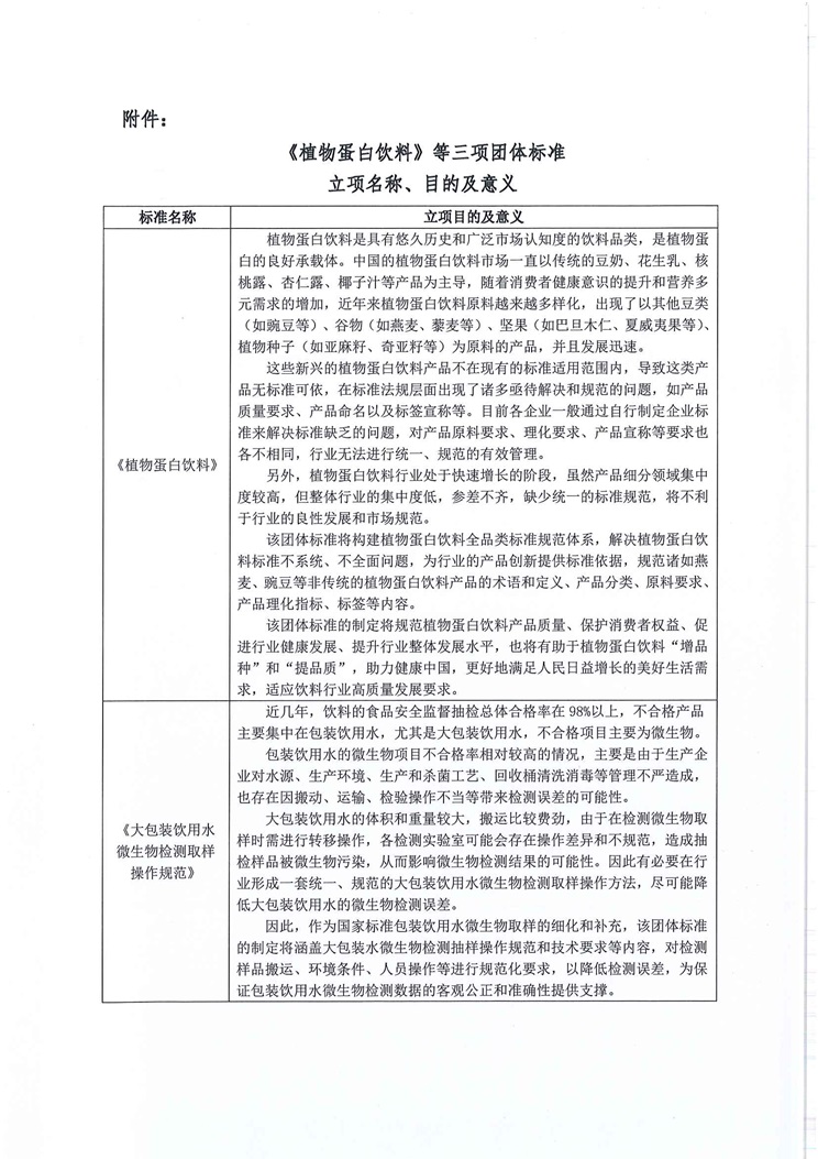 关于《植物蛋白饮料》等三项团体标准立项计划征求意见的通知