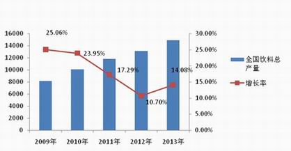 随着我国经济进入稳定发展期,中国饮料行业在经历20年的高速发展期后,从09年开始逐步走向理性发展,饮料企业开始深耕市场、创新整合,行业开始了有节奏的发展,企业扩大产能、投资建厂、推出新品、扩大市场,全国饮料增长率复苏上扬,总产量增长率达到14.08%(见图1)。2009年以来,饮料企业无形中已渐渐形成“单双年轮作”(年份)的企业扩张规律——单年规划谋扩产,第二年(双年)投产试运行,第三年(单年)满负荷运行并开始两年一轮的规划谋扩产。