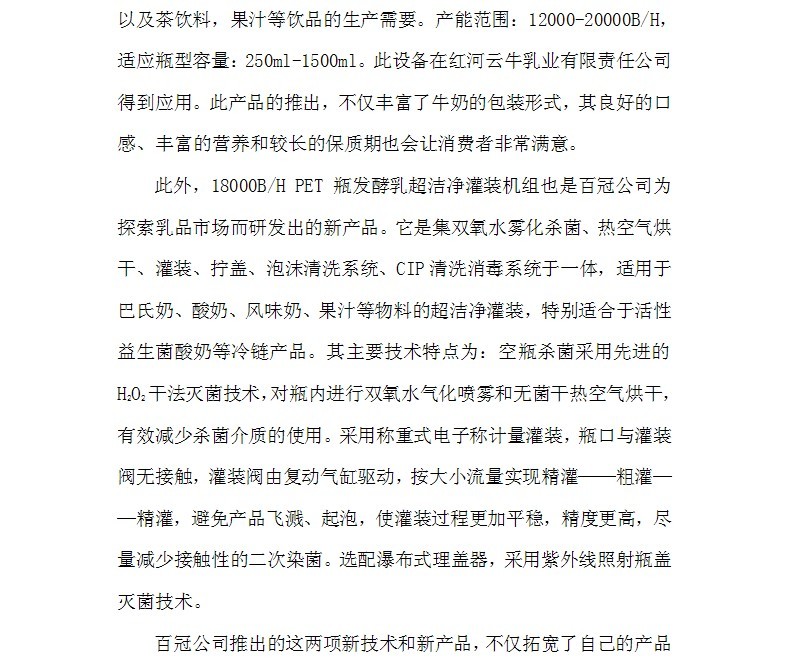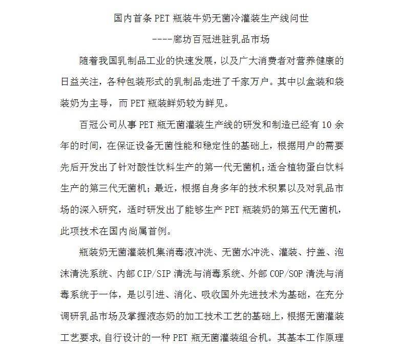 国内首条PET瓶装牛奶无菌冷灌装生产线问世