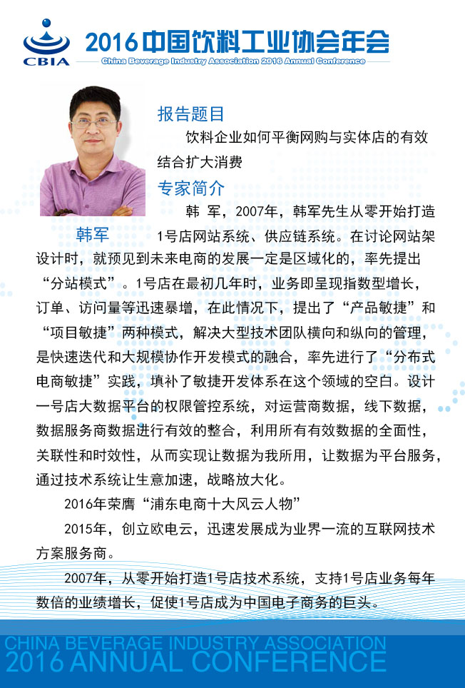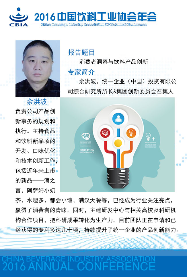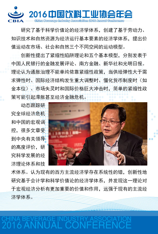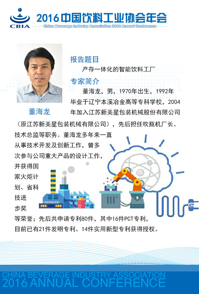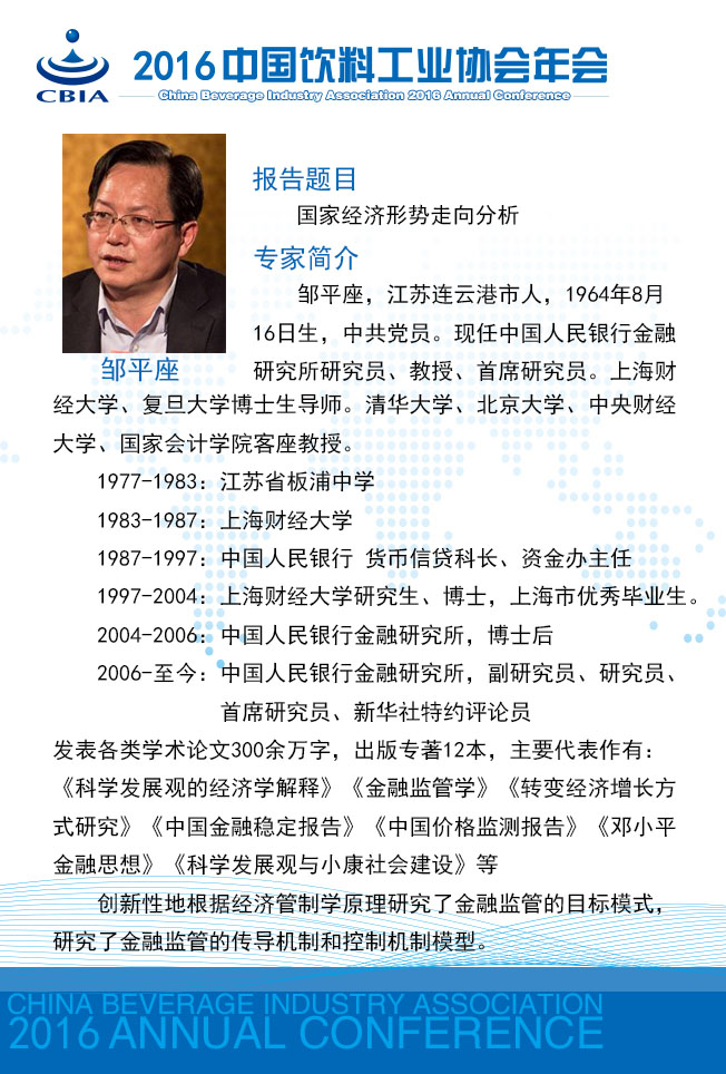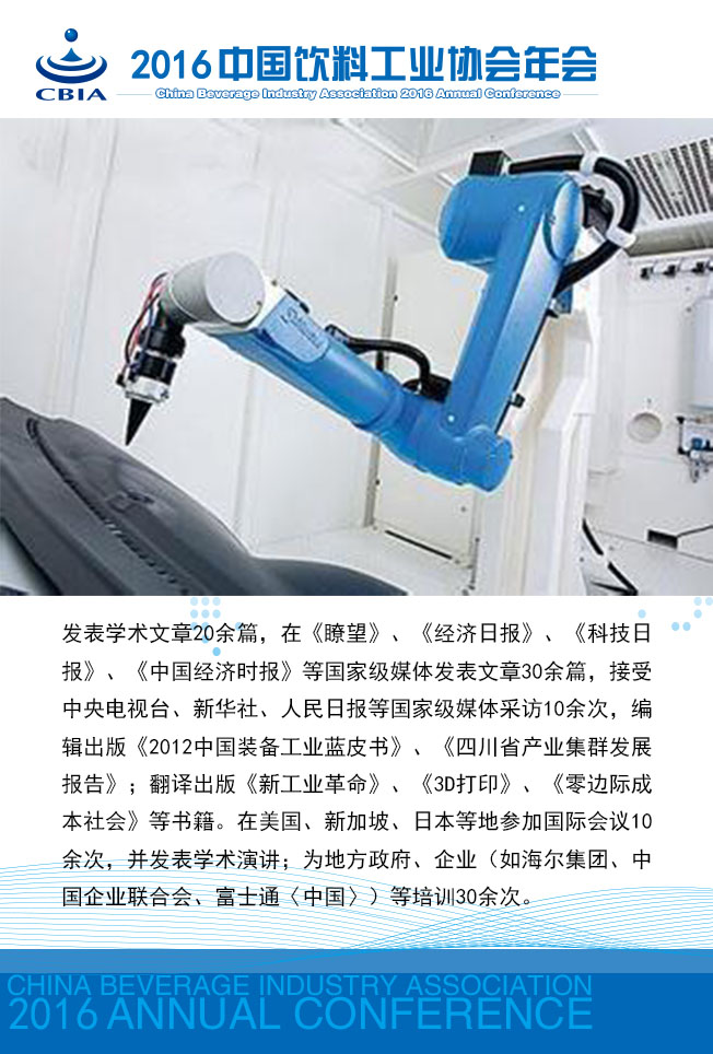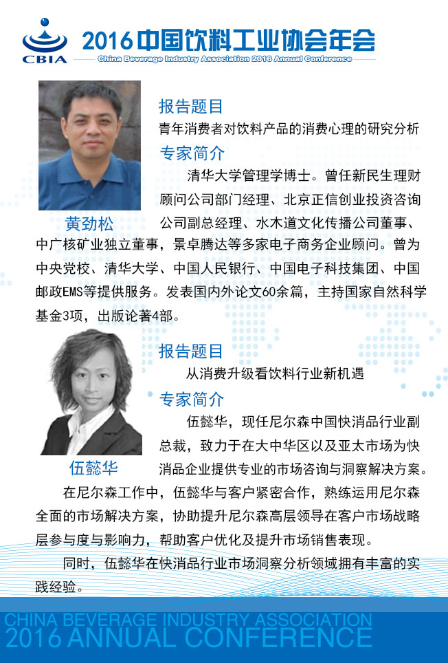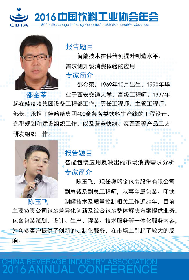 “2016中国饮料工业协会年会”将于11月23~25日在江苏省张家港市召开。 本次年会将以“消费升级 智能制造”为主题,着眼需求侧、着力供给侧,邀请相关专家多视角解读饮料消费市场的新特点,归纳消费者需求特征,引导企业把握产品和营销方式的创新;邀请国家主管部门与相关专家解析国家对“智能制造”的鼓励政策及如何实现饮料行业的“智能制造”。 今天,小编向您介绍本次年会强大的专家阵容:
