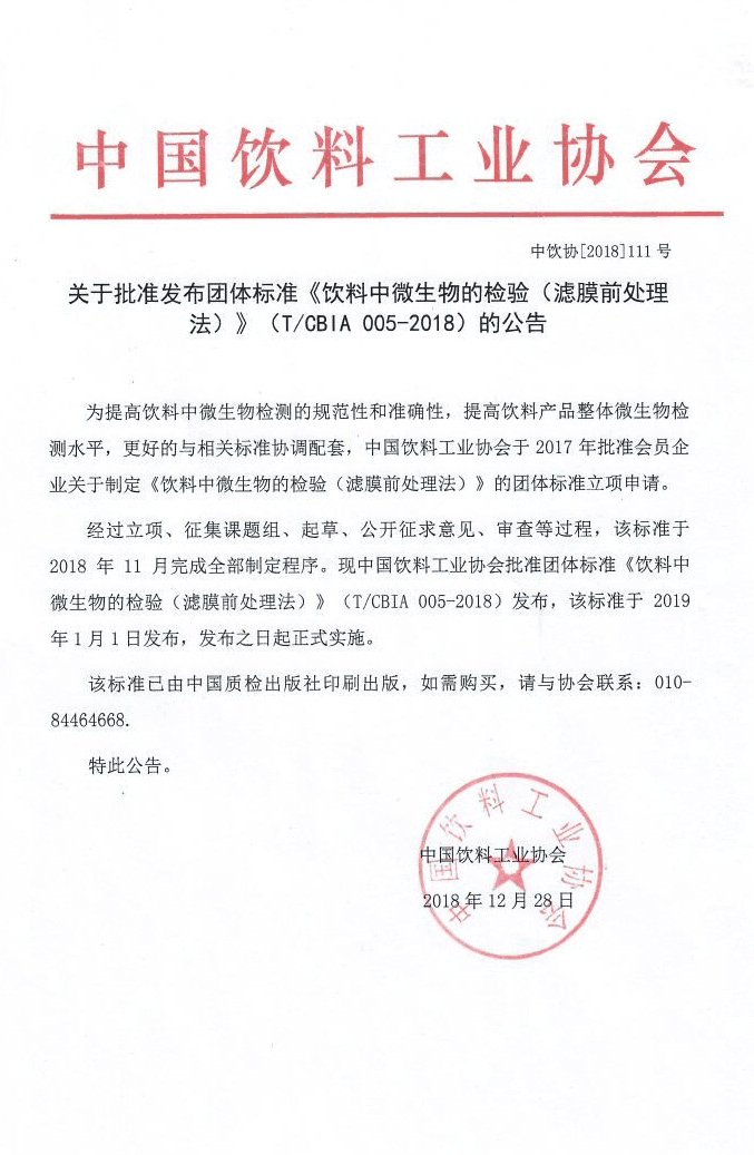 关于批准发布团体标准《饮料中微生物的检验(滤膜前处理法)》(T/CBIA 005-2018)的公告