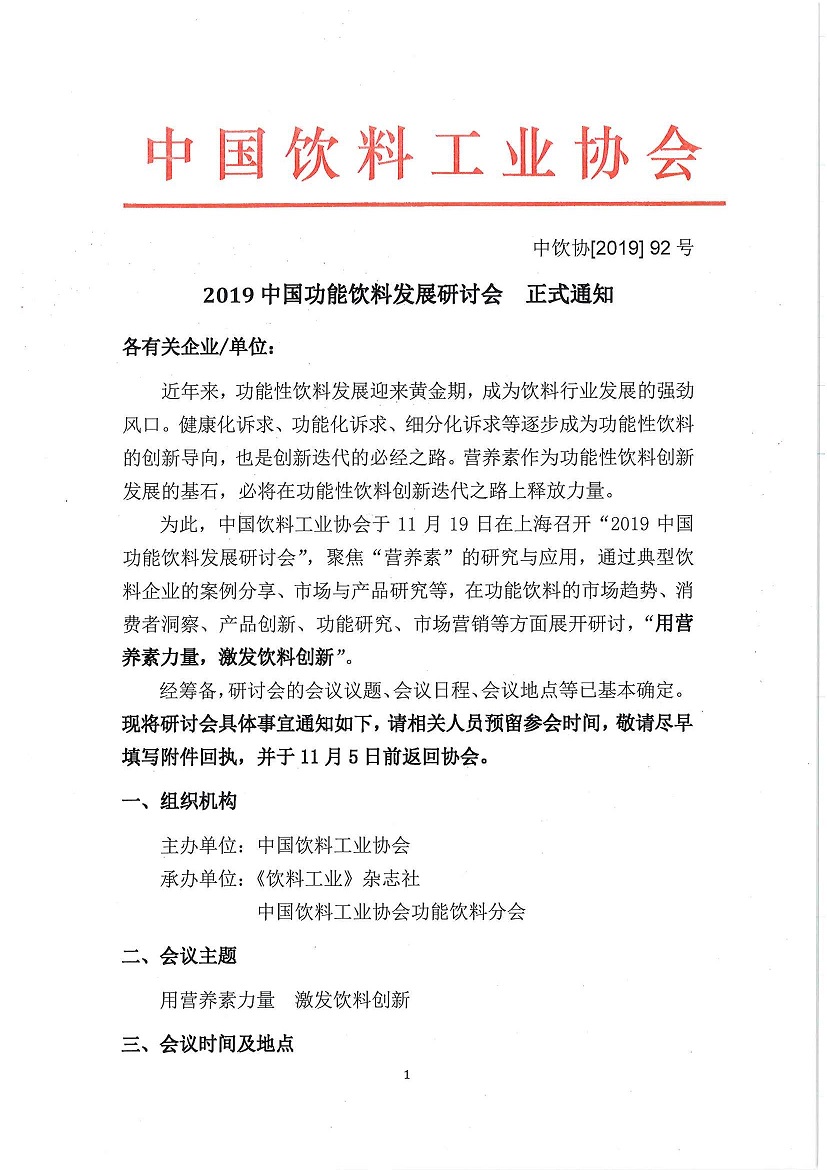 2019中国功能饮料发展研讨会 正式通知