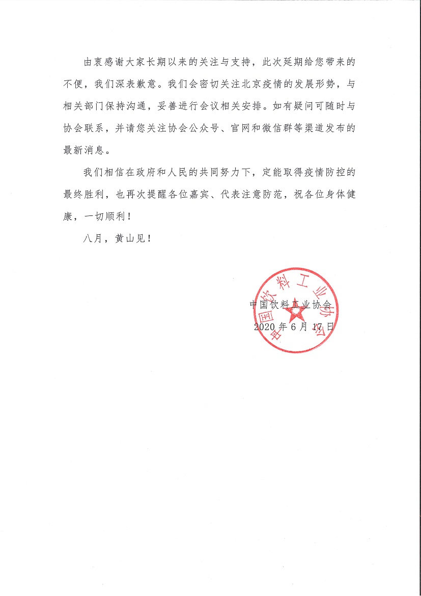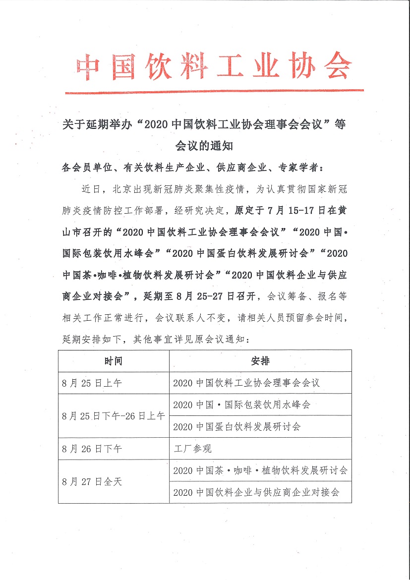 关于延期举办“2020中国饮料工业协会理事会会议”等会议的通知