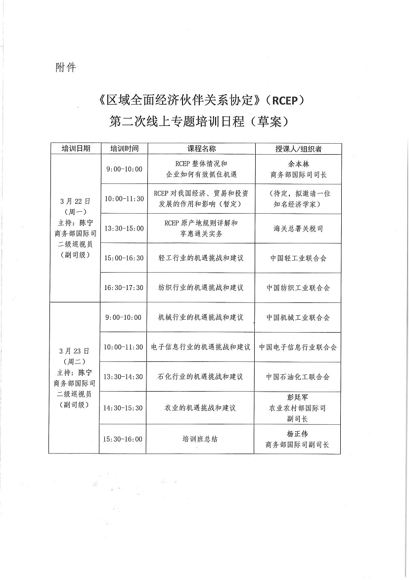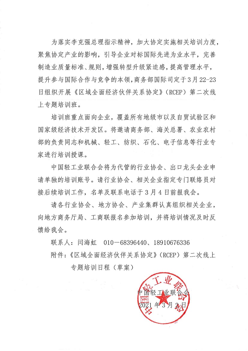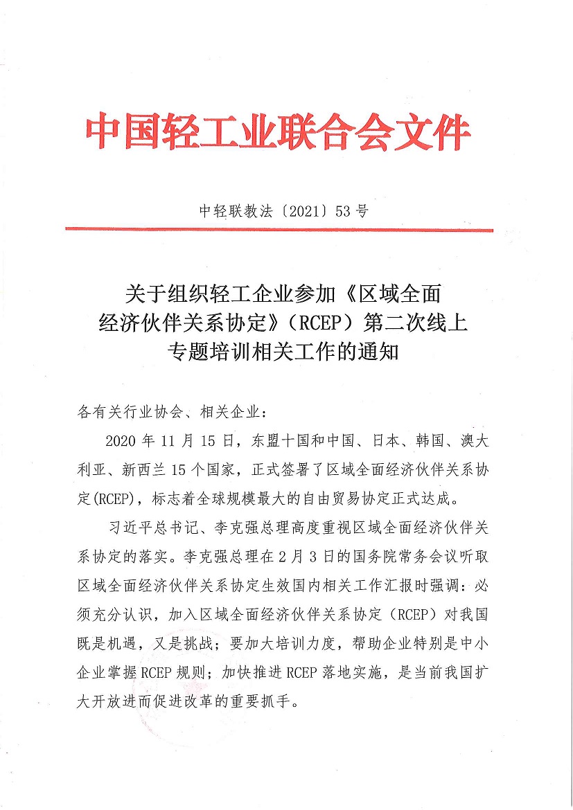 关于组织轻工企业参加《区域全面经济伙伴关系协定》第二次线上专题培训的通知