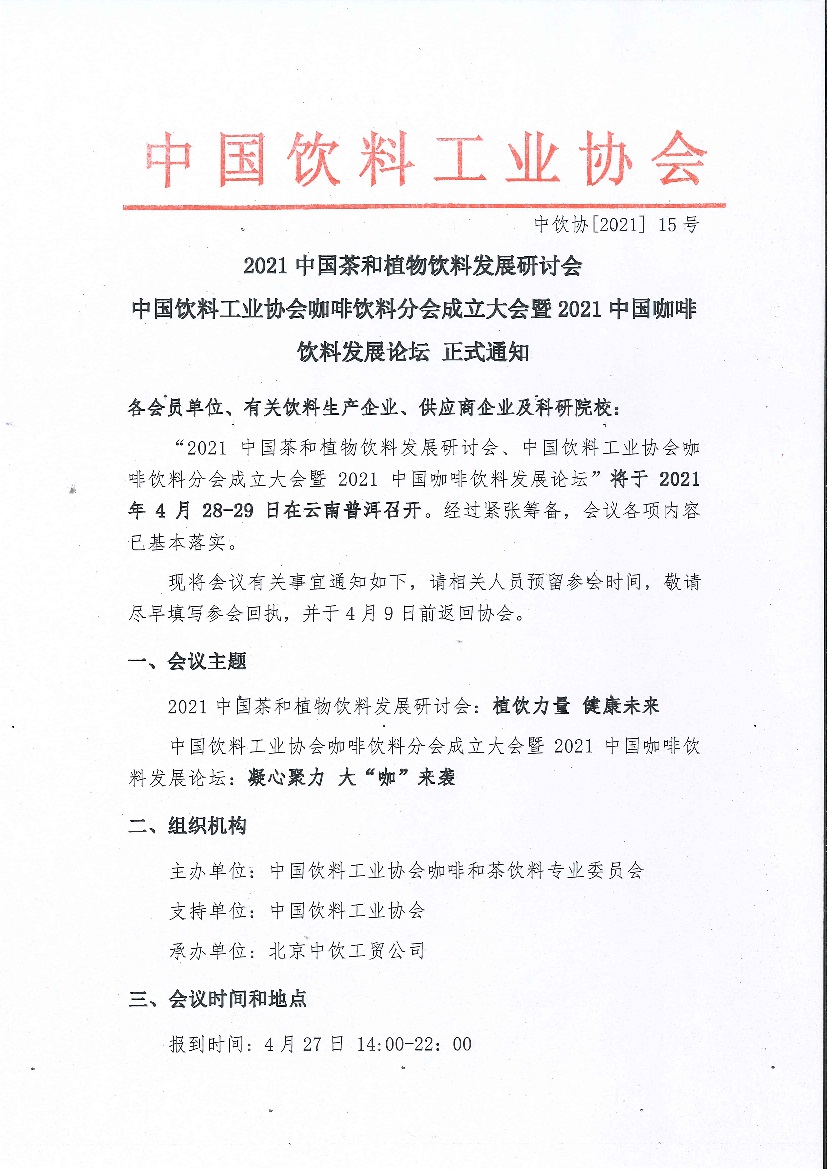 正式通知|2021中国茶和植物饮料发展研讨会、中国饮料工业协会咖啡饮料分会成立大会暨2021中国咖啡饮料发展