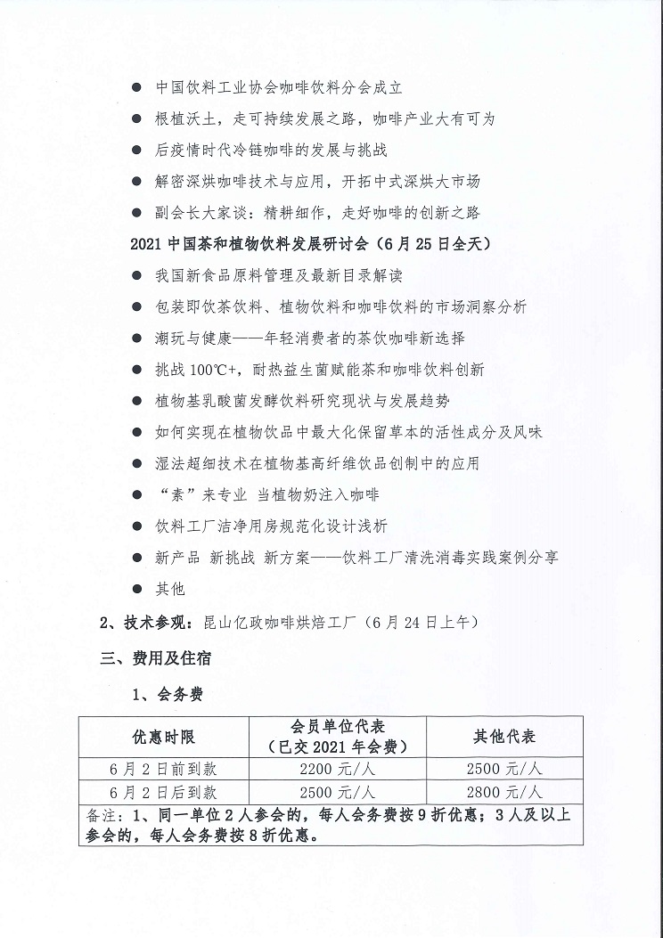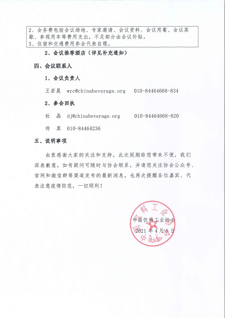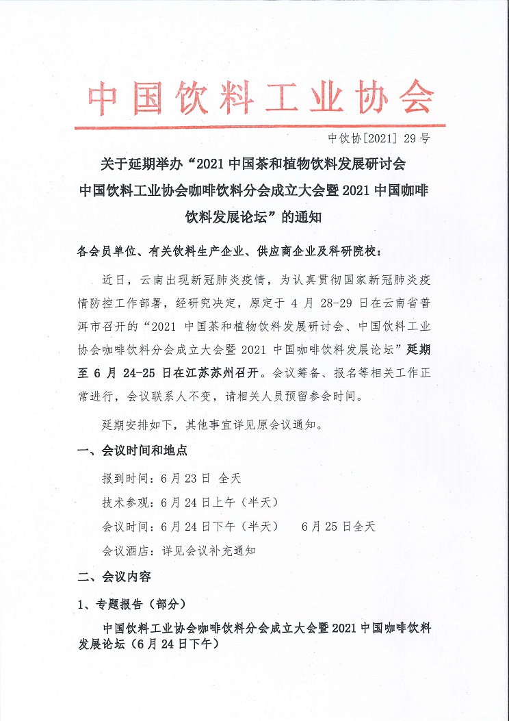 关于延期举办“2021中国茶和植物饮料发展研讨会、中国饮料工业协会咖啡饮料分会成立大会暨2021中国咖啡饮料