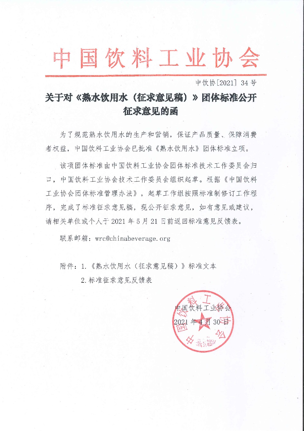 关于对《熟水饮用水(征求意见稿)》团体标准公开征求意见的函