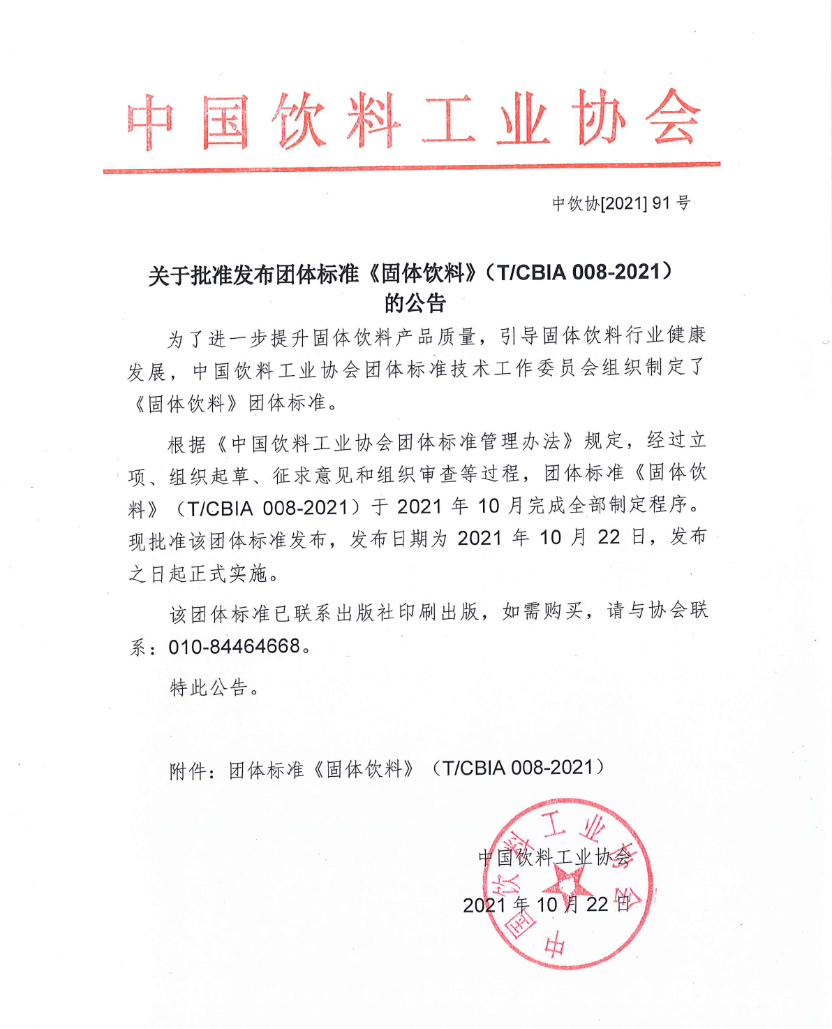 关于批准发布团体标准《固体饮料》(T/CBIA 008-2021)的公告