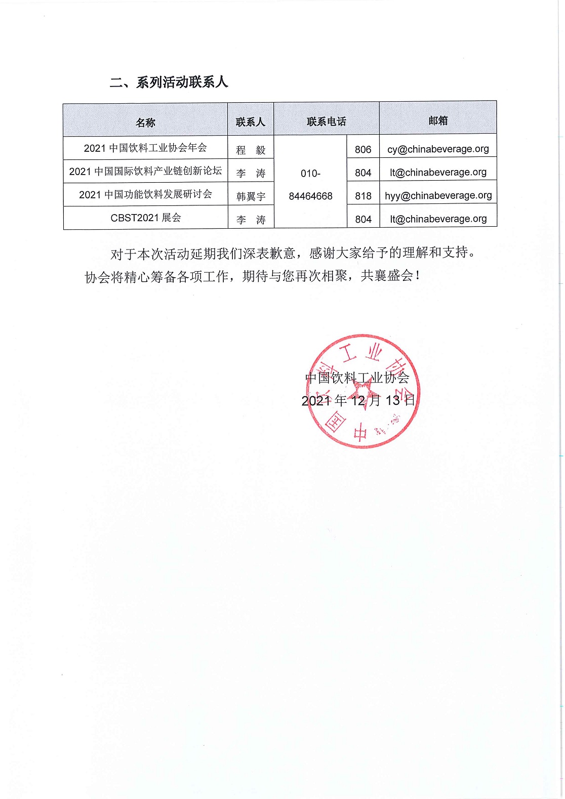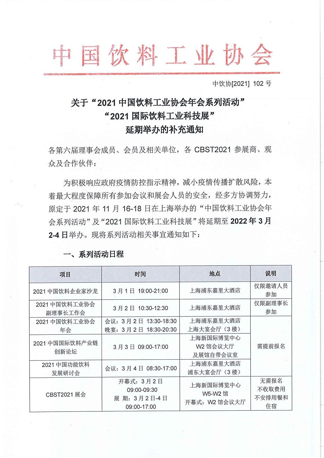 关于“2021中国饮料工业协会年会系列活动”“2021国际饮料工业科技展”延期举办的补充通知