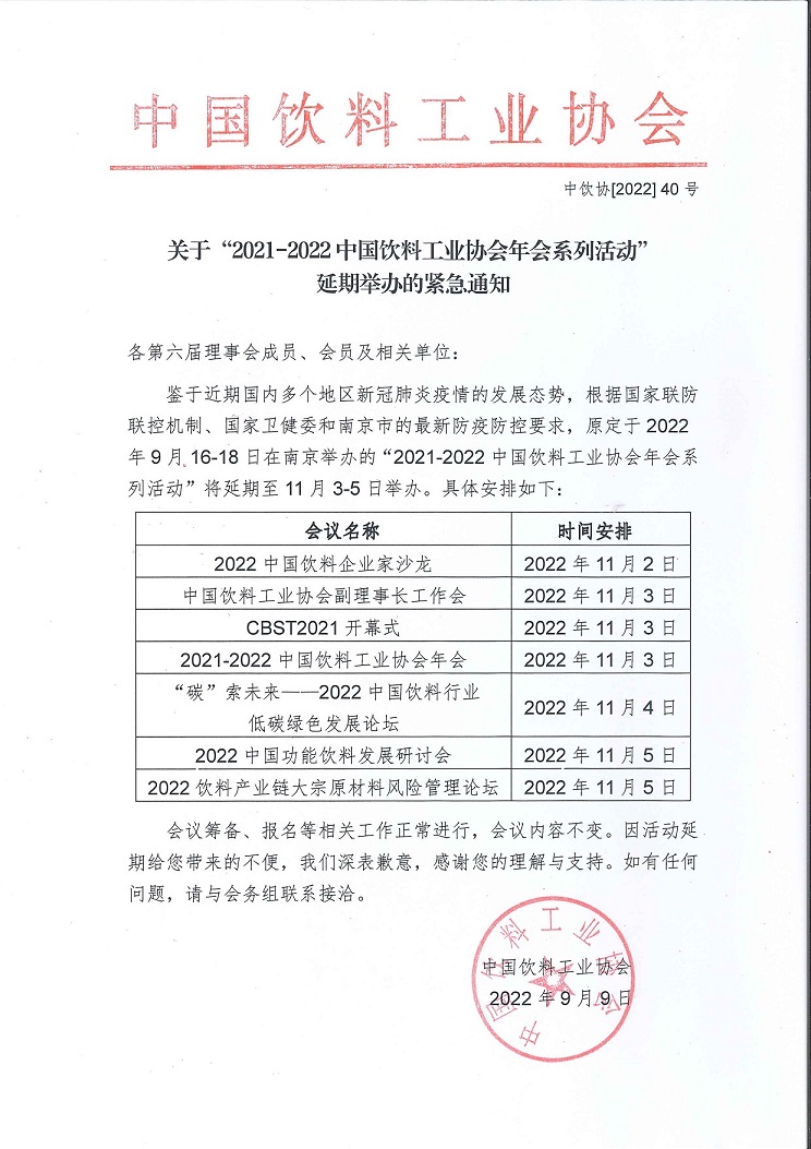 关于“2021-2022中国饮料工业协会年会系列活动”延期举办的紧急通知