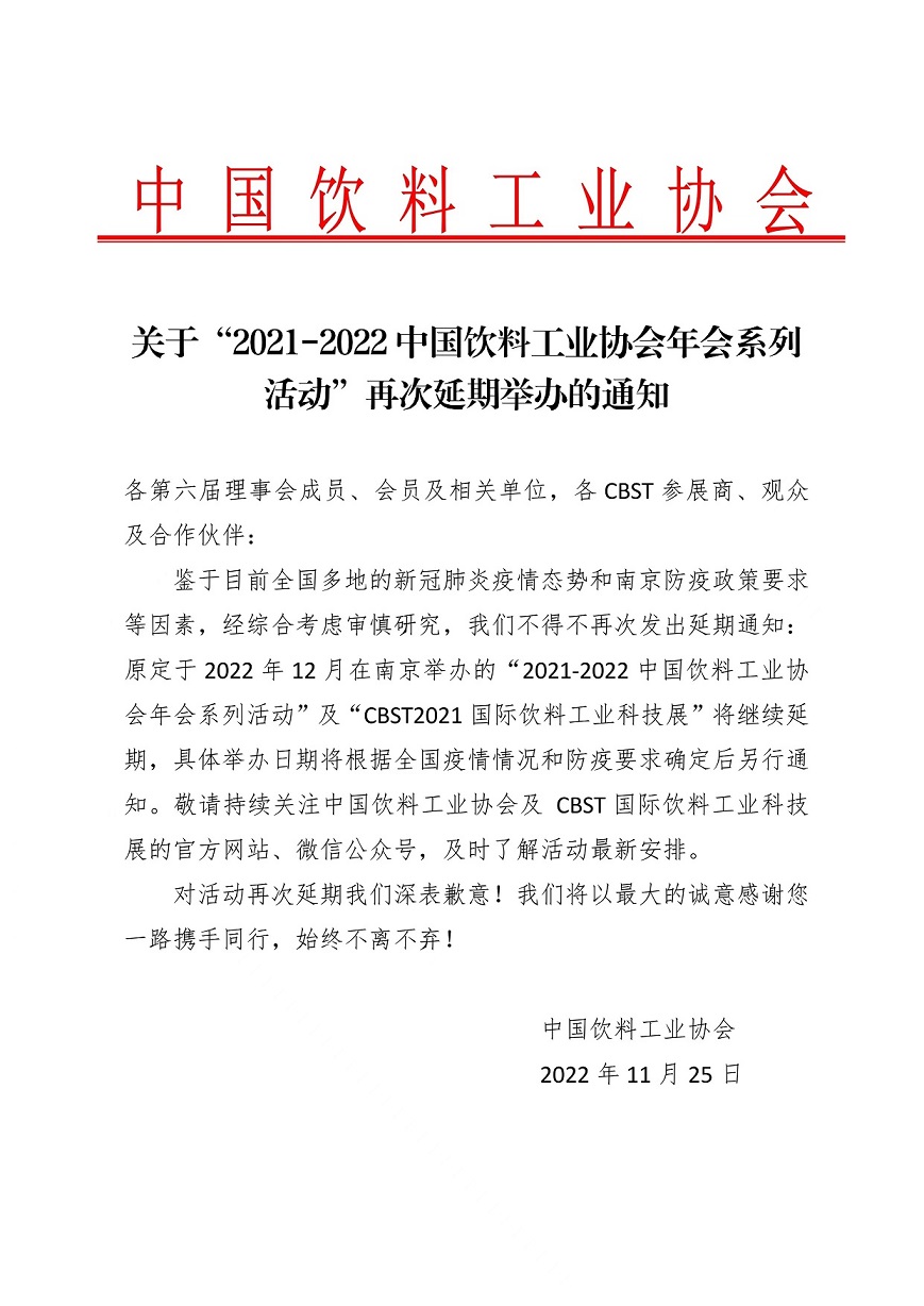 关于“2021-2022中国饮料工业协会年会系列活动”再次延期举办的通知