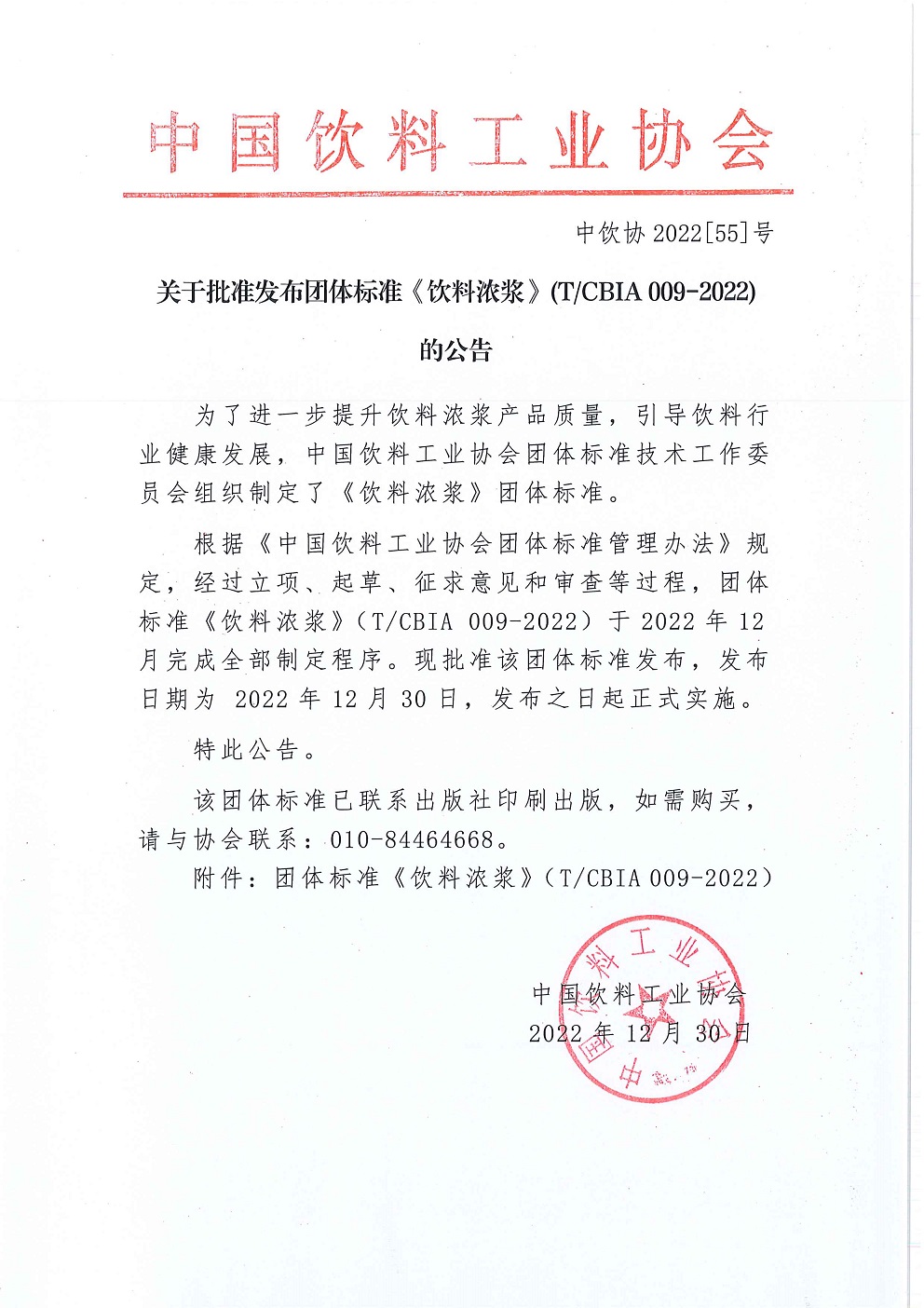 关于批准发布团体标准《饮料浓浆》(T/CBIA 009-2022) 的公告