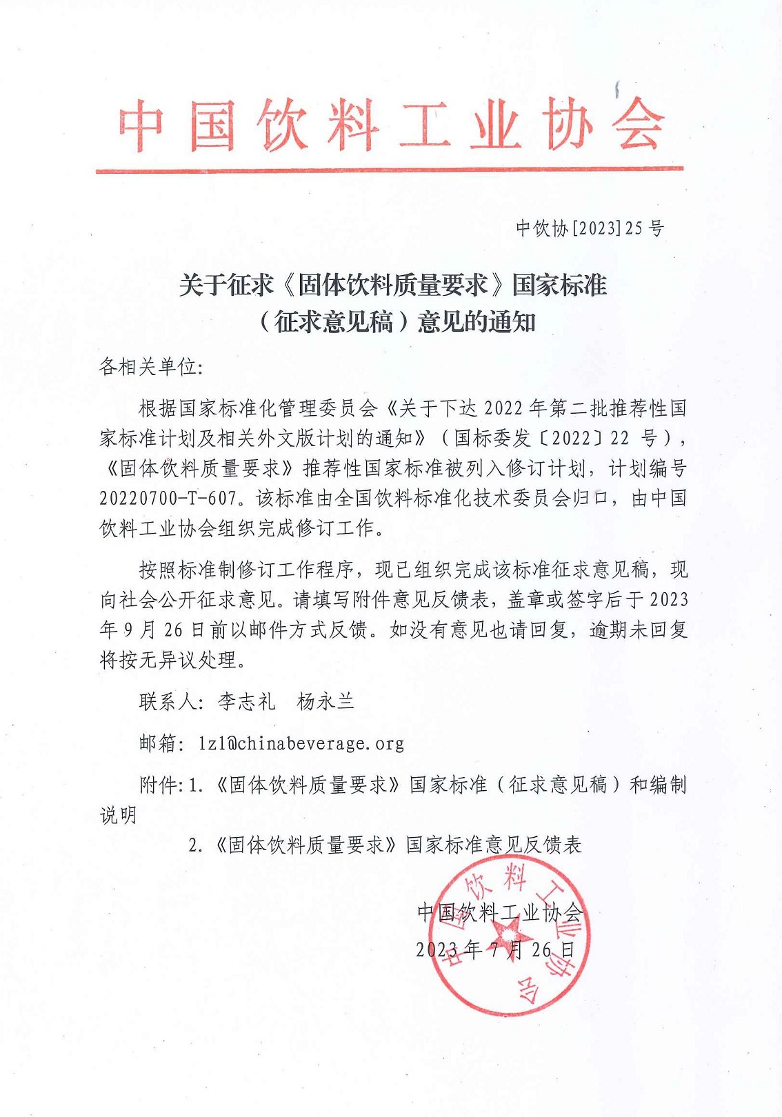 关于征求《固体饮料质量要求》国家标准(征求意见稿)意见的通知