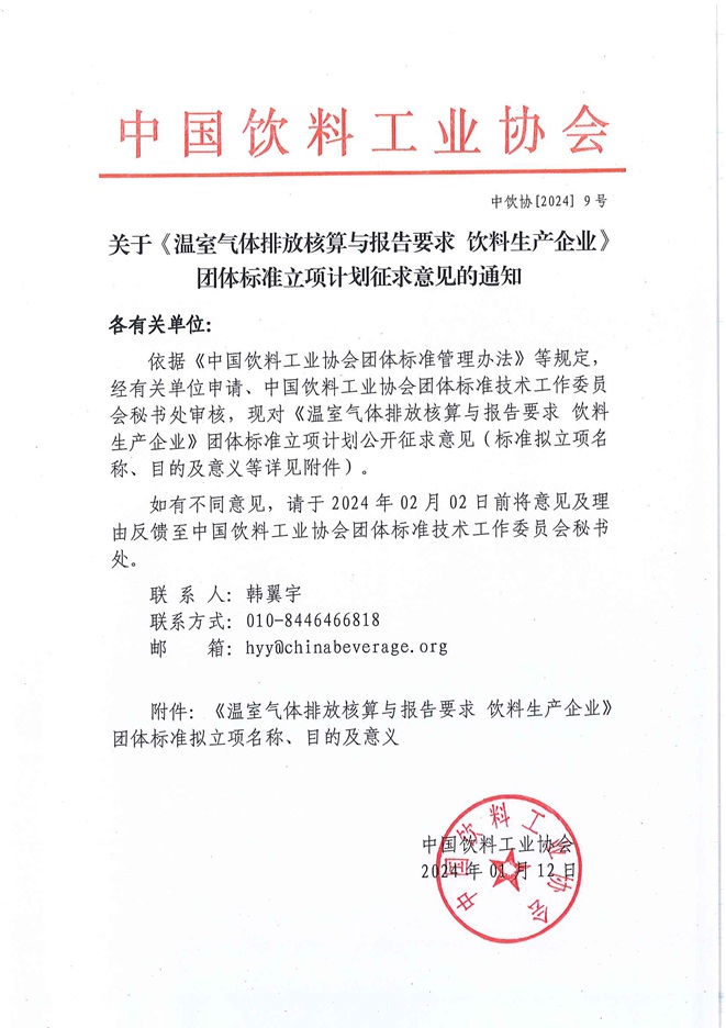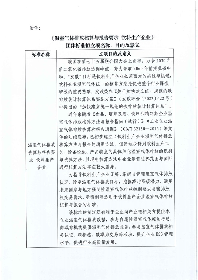 关于《温室气体排放核算与报告要求 饮料生产企业》团体标准立项计划征求意见的通知