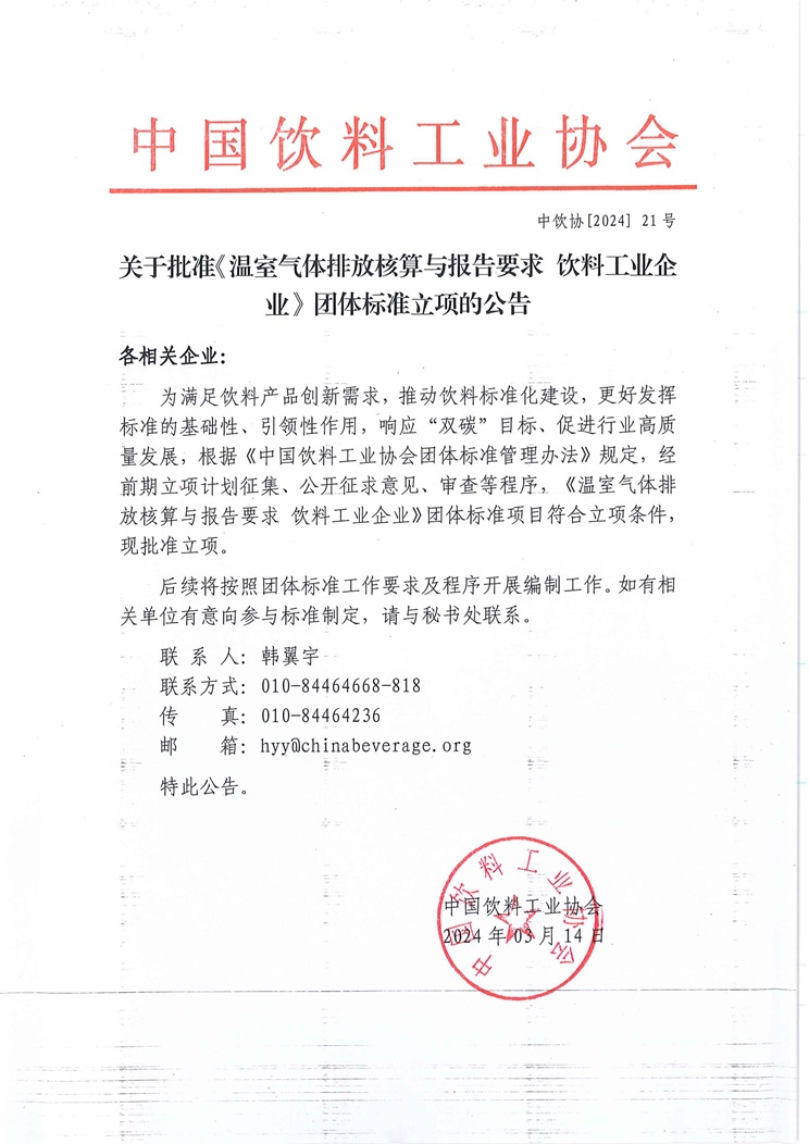 关于批准《温室气体排放核算与报告要求 饮料工业企业》团体标准立项的公告