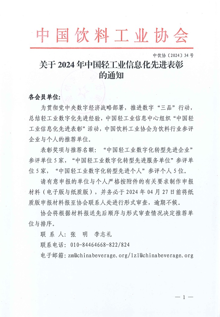 关于2024年中国轻工业信息化先进表彰工作的通知