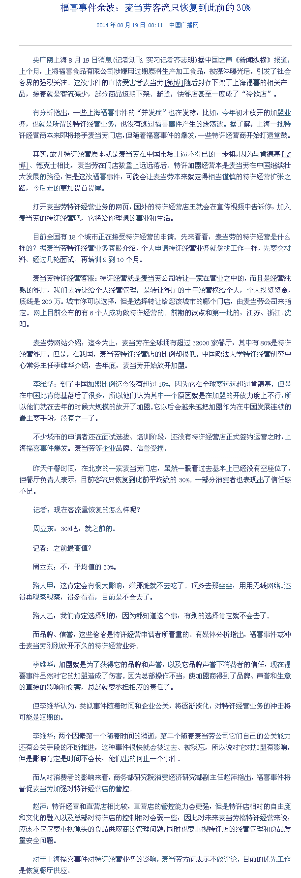 福喜事件余波:麦当劳客流只恢复到此前的30%