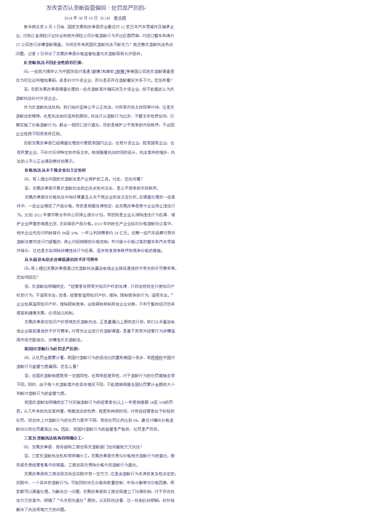 发改委否认垄断监管偏弱:处罚是严厉的