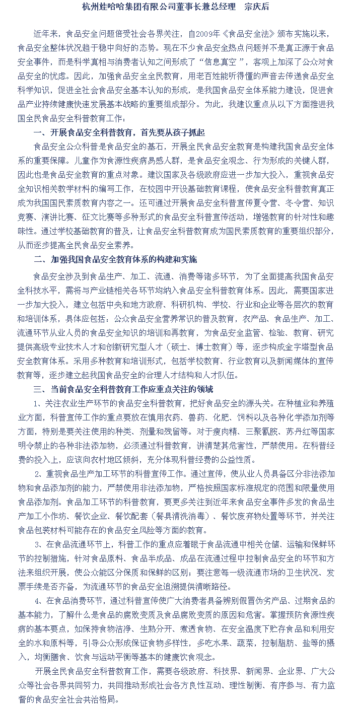 宗庆后两会建议六:关于推进全民食品安全科普教育工作的建议