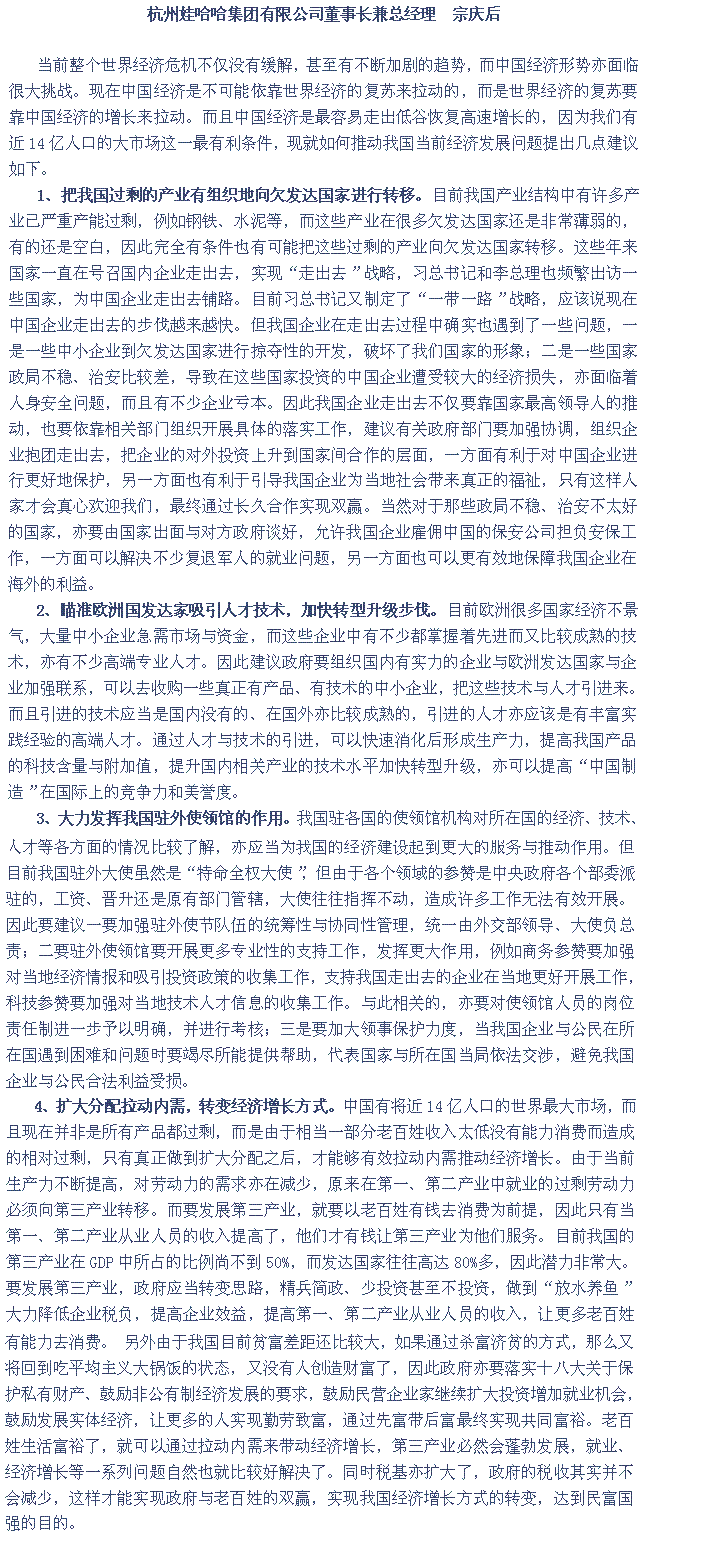 宗庆后两会建议四:关于推动我国当前经济发展的若干建议