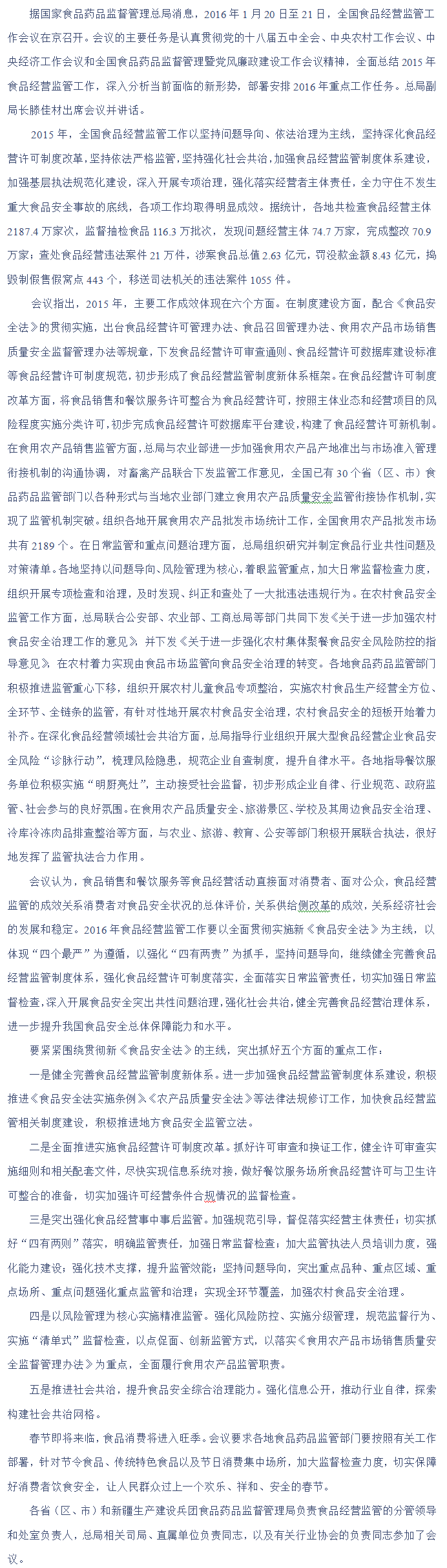 食药总局明确:2016年食品经营监管工作的五大要求