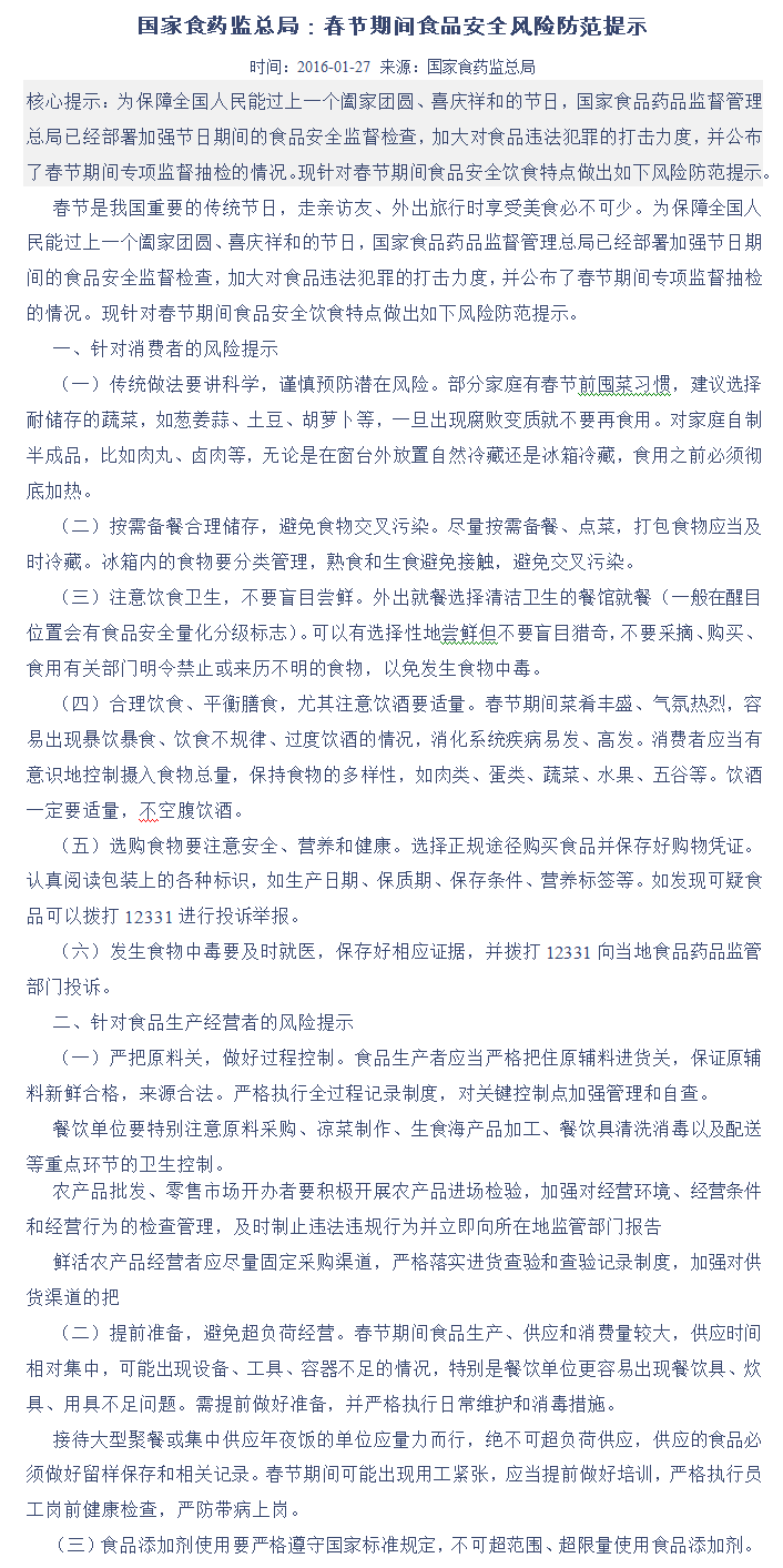 国家食药监总局:春节期间食品安全风险防范提示