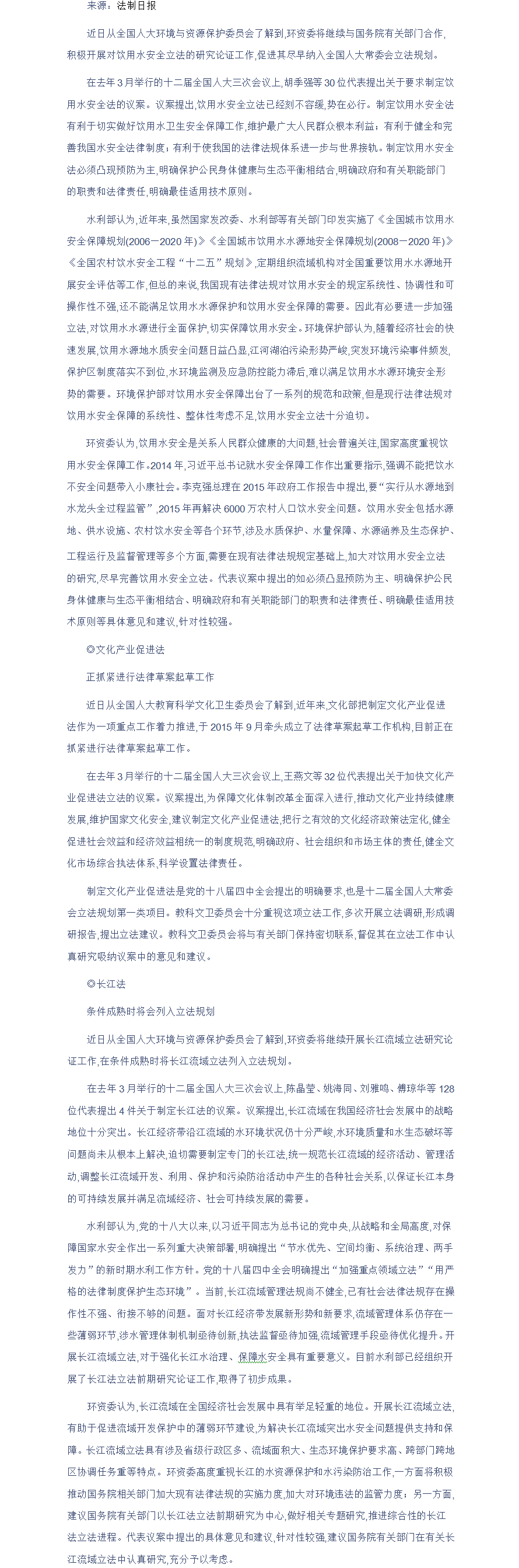 立法进展:环资委开展饮用水安全法研究论证 长江法或列入立法规划