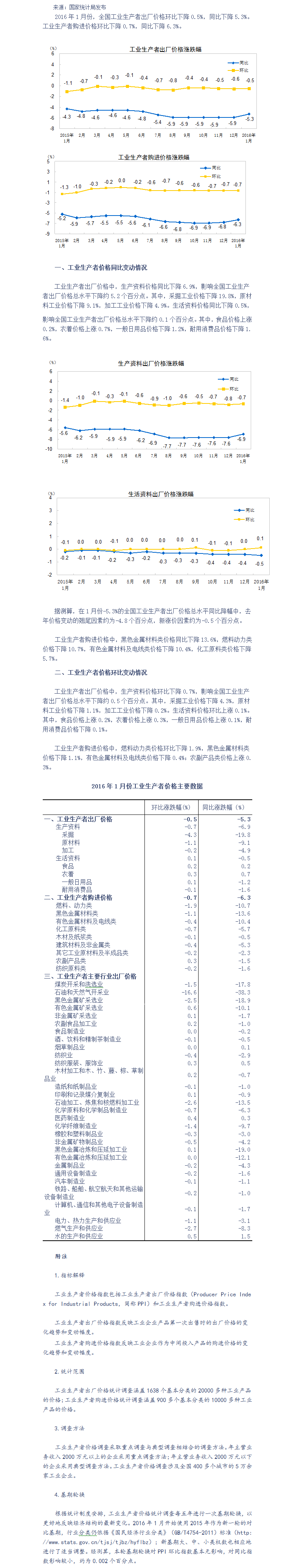 2016年1月份工业生产者出厂价格同比下降5.3%